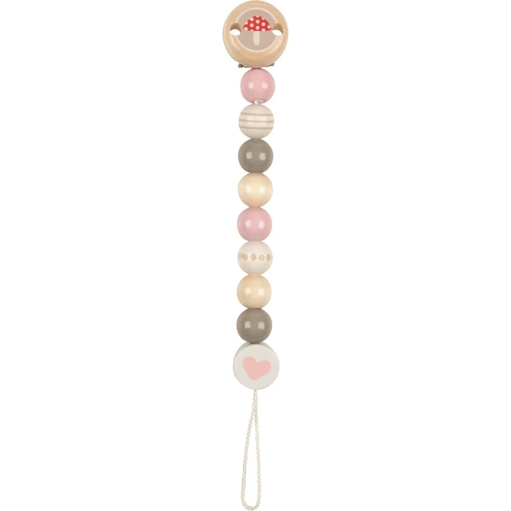 Son attache champignon, ses perles en bois roses, grises et beiges se marient parfaitement et s’alternent le long de la cordelette souple offrant une douce harmonie à cet accessoire indispensable de jour comme de nuit. Un attache tétine qui s’accroche aussi bien aux vêtements de votre bébé qu’à son body, son landau, son doudou, sa poussette ou qu’au siège auto. Votre bout de chou comprendra rapidement que son objet favori, qui le calme, le réconforte, le détend et le sécurise, se situe au bout de cette jolie petite chainette et en voulant le récupérer et le mettre dans sa bouche, votre bébé travaillera sa dextérité et sa coordination œil-main.