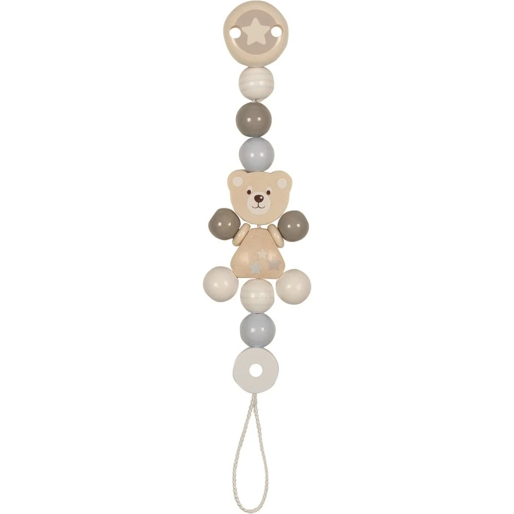La tétine est attachée à une boucle. Grâce à son joli design avec un petit ours et sa coloration subtile, il s’adapte à presque toutes les tenues de bébé et devient rapidement un joli accroche-regard. La tétine est en bois et peut être nettoyée avec un chiffon humide.