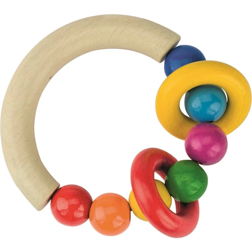 Un joli hochet en bois pour l’éveil de votre bébé pas comme les autres. Ce hochet en bois est composé, d’un côté, d’un demi anneau de bois rigide couleur naturelle, et de perles et d’anneaux en bois colorés enfilés sur une cordelette de l’autre côté. Grâce à cet anneau semi-rigide, très facile à prendre en main et à manipuler, votre bébé développera sa motricité fine et sa coordination œil-main. Il développera sa perception visuelle, grâce aux jolies couleurs de l’arc-en-ciel des perles de bois, tactile en touchant les différentes textures (lisse pour le bois, un peu rêche pour la cordelette), gustative en portant à sa bouche, mordillant pour en connaître la consistance, et pourra entrainer ses réflexes de préhension, et d’habileté en déplaçant les deux petits anneaux de bois autour du hochet ainsi qu’en tournant les différents éléments. De ses 3 mois à ses 18 mois, votre bébé pourra agripper ce hochet semi-rigide en bois pour exercer les muscles de ses petites mains et s’éveiller doucement au monde qui l’entoure.