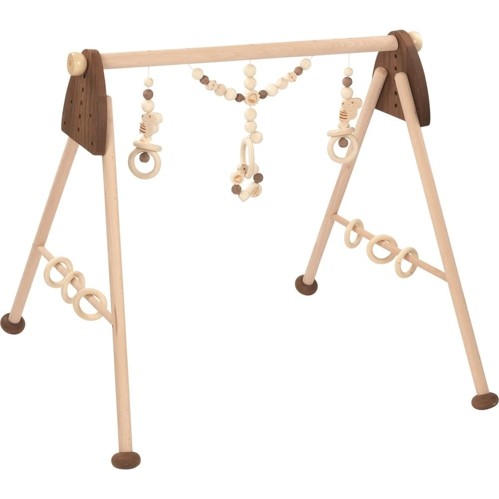 Ce portique d’activités, adapté aux bébés dès 3 mois, stimulera votre petit ange dans son développement, son renforcement musculaire et son apprentissage. Avec sa forme particulière, aux couleurs boisées et naturelles, ces patins en bois qui offrent de la stabilité à la structure de jeux, ses trois hochets suspendus agrémentés de différentes sortes de perles (grosses, plus petites, customisées), d’anneaux rigides et de pièces taillées en écureuil, votre bébé aura sa salle de gymnastique personnelle : différentes formes, différents éléments pour différents sons et différentes hauteurs de suspension pour obliger bébé à progresser en motricité en lui donnant envie de se mouvoir pour attraper ses jolis objets suspendus ou encore les anneaux en bois rigides accrochés sur les côtés entre les pieds du portique d’activités et les découvrir. Le portique d’activités participe également activement au développement des perceptions sensorielles du bébé en lui faisant découvrir des formes, des couleurs et des bruits différents et nouveaux.