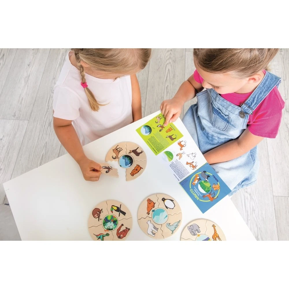 Le puzzle en bois aux couleurs naturelles propose un apprentissage ludique. Sur chaque pièce, des points de couleur facilitent la constitution des puzzles. Tout en jouant, l’enfant apprend à connaitre les animaux et situe leur environnement naturel. Les pièces en bois sont de très bonne qualité et découpées de telle sorte que les puzzles ne peuvent pas se mélanger.