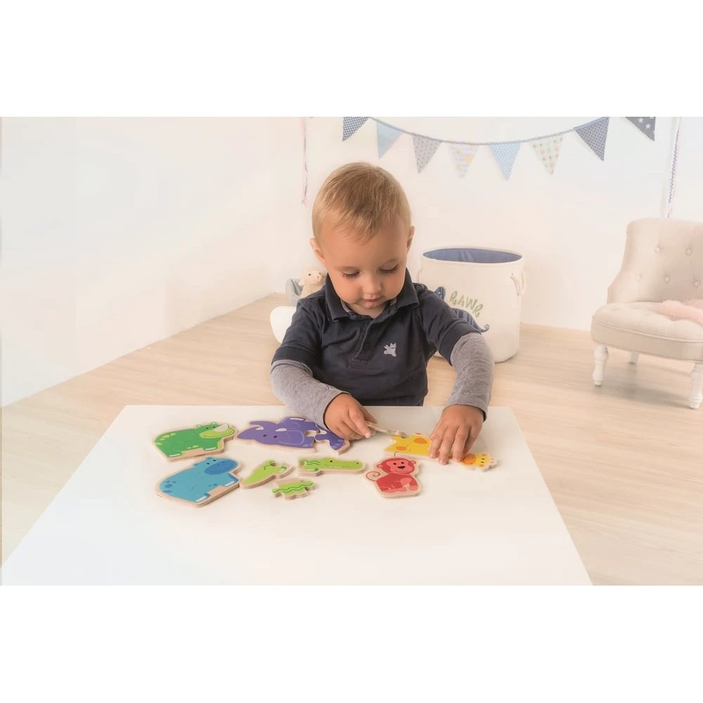 Ces six animaux de la jungle sont assez mélangés ! Lorsque les pièces du puzzle respectives sont correctement assemblées, les enfants s’entraînent à la coordination et à la reconnaissance de forme. Les couleurs des animaux sont d’une bonne aide et vous encouragent à les combiner correctement.