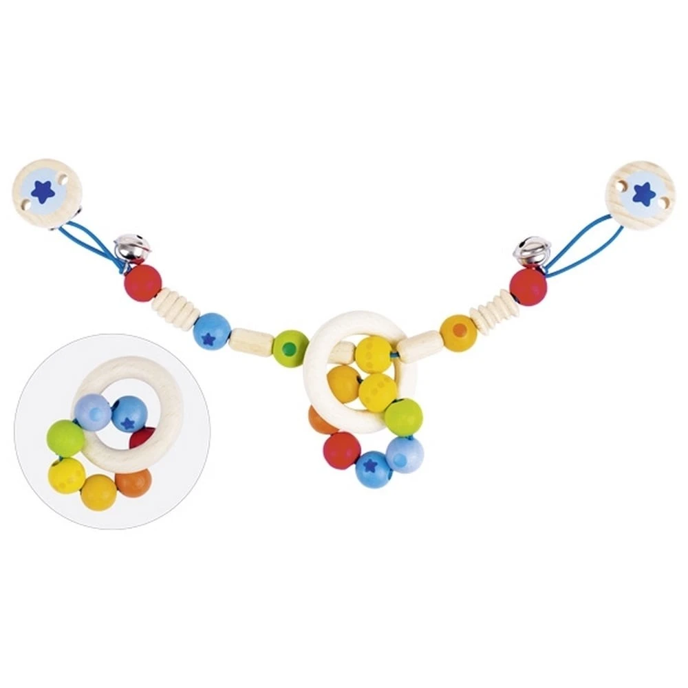 Accessoire de balade multifonction pour votre bébé : un accessoire joyeux et stimulant et un jouet d’éveil, 2 en 1 ! Grâce à cette chaîne de poussette décorative et ludique, les promenades deviendront rapidement les moments préférés de votre bébé, si ce n’était pas déjà le cas. Cette petite corde, où s’empilent des perles de bois colorées, des pièces de bois de différentes formes et des grelots pour former cette jolie chaîne de poussette décorative, pourra facilement et rapidement être clipper fermement à votre poussette, landau ou cosy. Mais ce n’est pas tout ! Le long de cette chainette colorée, un anneau rigide en bois traversé en son sein d’un hochet souple composé de plusieurs petites boules de bois colorées, peut être glissé et sorti. Ce hochet amovible aux deux anneaux entrelacés est facile à prendre en main et attisera la curiosité de votre bout de chou. Deux parfaits accessoires en bois pour bébé pour éveiller votre enfant au cours de vos sorties, le stimuler et encourager le développement de sa motricité fine et sa coordination œil-main. En plus d’entendre les grelots tintés à chaque déplacement de la poussette, votre bébé pourra occuper ses petites mains avec le hochet en bois. Il pourra le faire coulisser tout autour de l’anneau de bois ou inversement et tourner les petites perles de bois. Il pourra le mâchouiller, le lécher, le gouter sans risque car cet ensemble hochet et chaine de poussette en bois résiste à la salive et les couleurs ne sont pas nocives pour la santé de votre bébé.