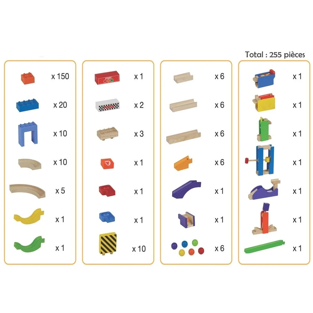 L’ensemble « Circuit à billes – Jeu en classe » comprend 255 pièces (en bois et en plastique, dont six billes), un plateau de jeu en bois, une boite de rangement en plastique et des feuilles d’exercices.