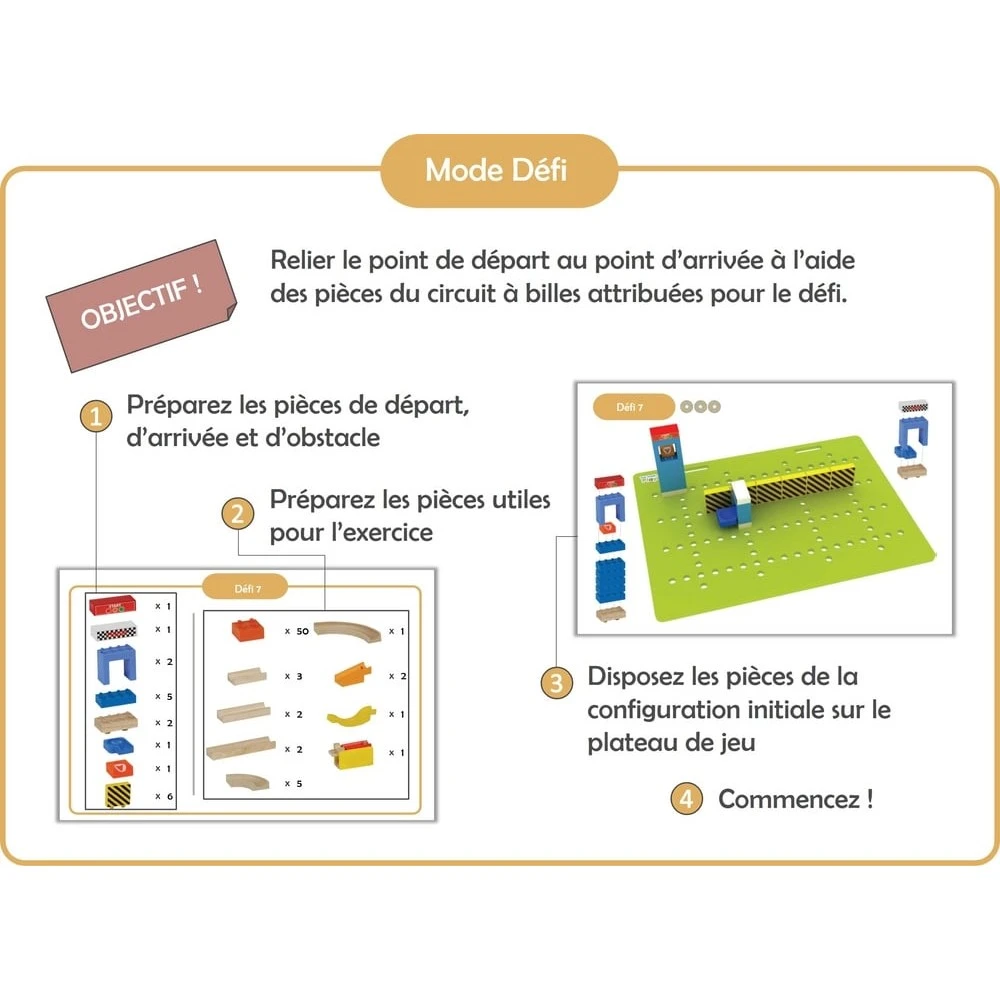 Les enfants peuvent assembler les circuits à billes suggérés (mode style libre) ou suivre des exercices de résolution de problèmes du niveau débutant au niveau avancé (mode défi). Dans chaque exercice, les enfants doivent utiliser les pièces assignées pour relier le point de départ au point d’arrivée tout en franchissant des obstacles. L’exercice s’accompagne d’un programme qui met la théorie en pratique.