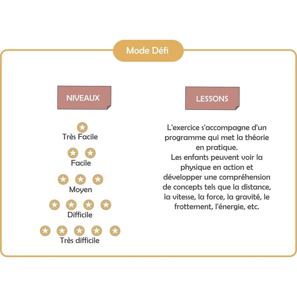 Les enfants peuvent voir la physique en action et développer une compréhension de concepts tels que la distance, la vitesse, la force, la gravité, le frottement, l’énergie, etc.