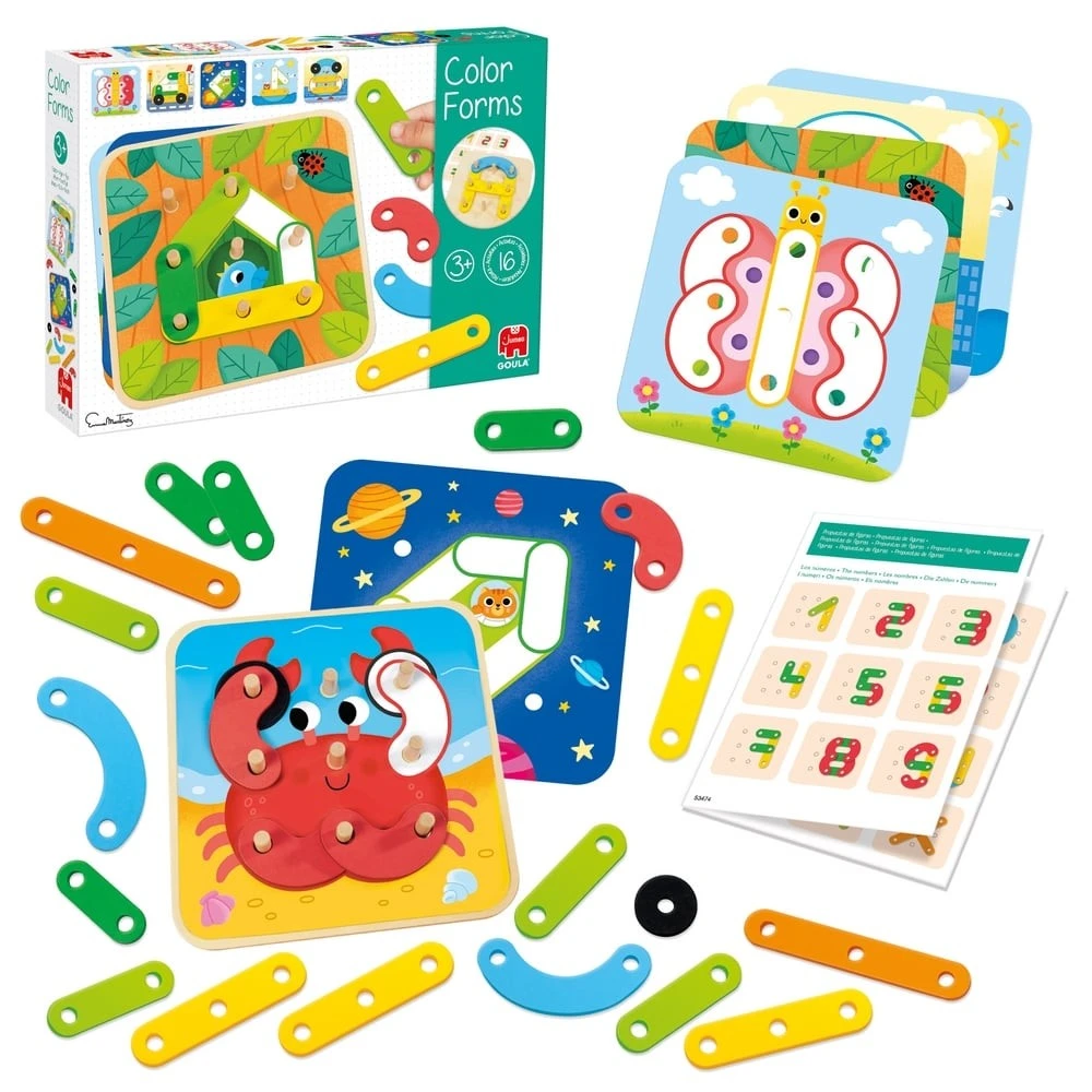Ce très joli jeu en bois permet différents modes de jeu. Pour commencer, il peut être joué librement, faisant ainsi appel à la créativité de votre enfant. Il peut être utilisé avec les fiches modèles (placées sur le support de jeu ou non). Le but du jeu est alors de venir compléter les parties blanches des illustrations en enfilant les pièces adéquates (forme et couleur). Enfin, il peut servir d’outil d’initiation à l’écriture, aux mathématiques et à la géométrie. Votre bambin devra alors observer les différents symboles ou formes du livret et tenter de les reproduire à l’identique. Mais attention, ce mode de jeu est plus complexe, car les modèles sont en taille réduite !
