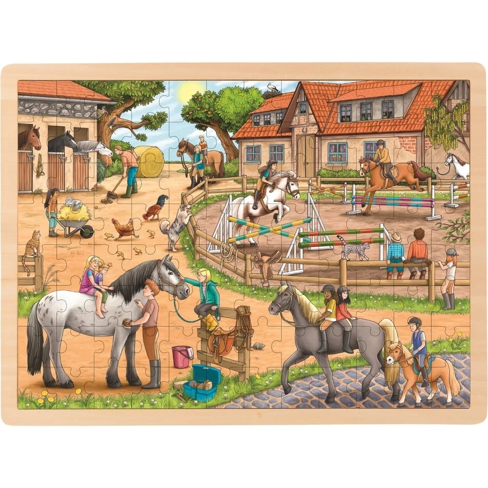 Lorsque l’on a reconstitué ce puzzle de 96 pièces dans le cadre en bois, apparaissent les chevaux dans leur belle écurie.
