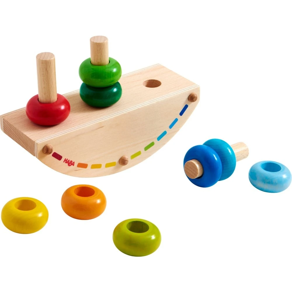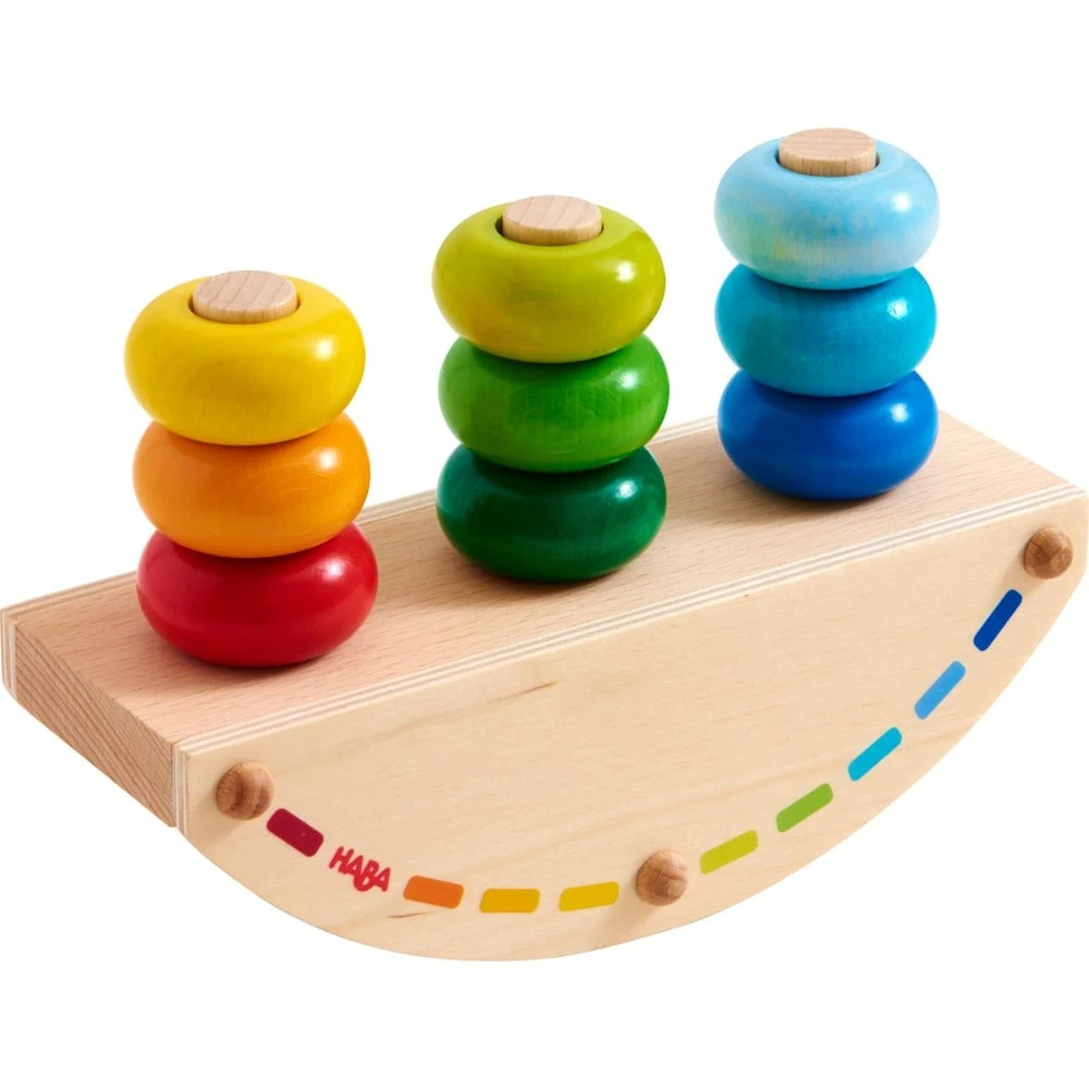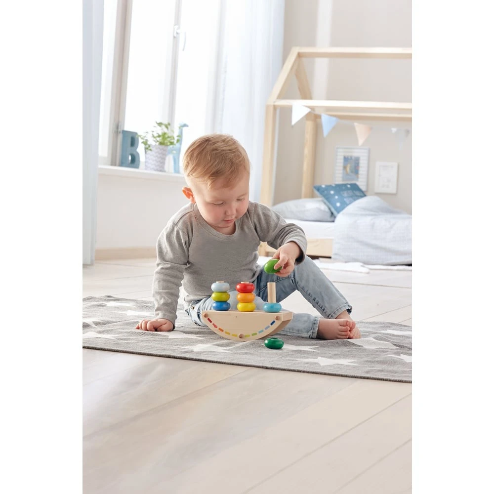Ce magnifique jouet en bois offrira à votre bout de chou son premier plaisir d’enficher. Il sera un excellent outil pour stimuler sa motricité fine, sa coordination main-œil, sa patience et sa concentration. Ce jouet à bascule favorisera l’apprentissage des couleurs (reconnaissance, désignation et classement) et permettra à votre enfant de se familiariser avec la notion d’équilibre. Ce jeu en bois se compose d’un plateau en bois à bascule, de 3 bâtonnets en bois et de 9 anneaux en bois aux couleurs de l’arc-en-ciel. En fonction du nombre d’anneaux colorés enfichés sur les bâtonnets et de leur emplacement sur la balance, celle-ci basculera d’un côté ou de l’autre ou réussira à trouver son équilibre.