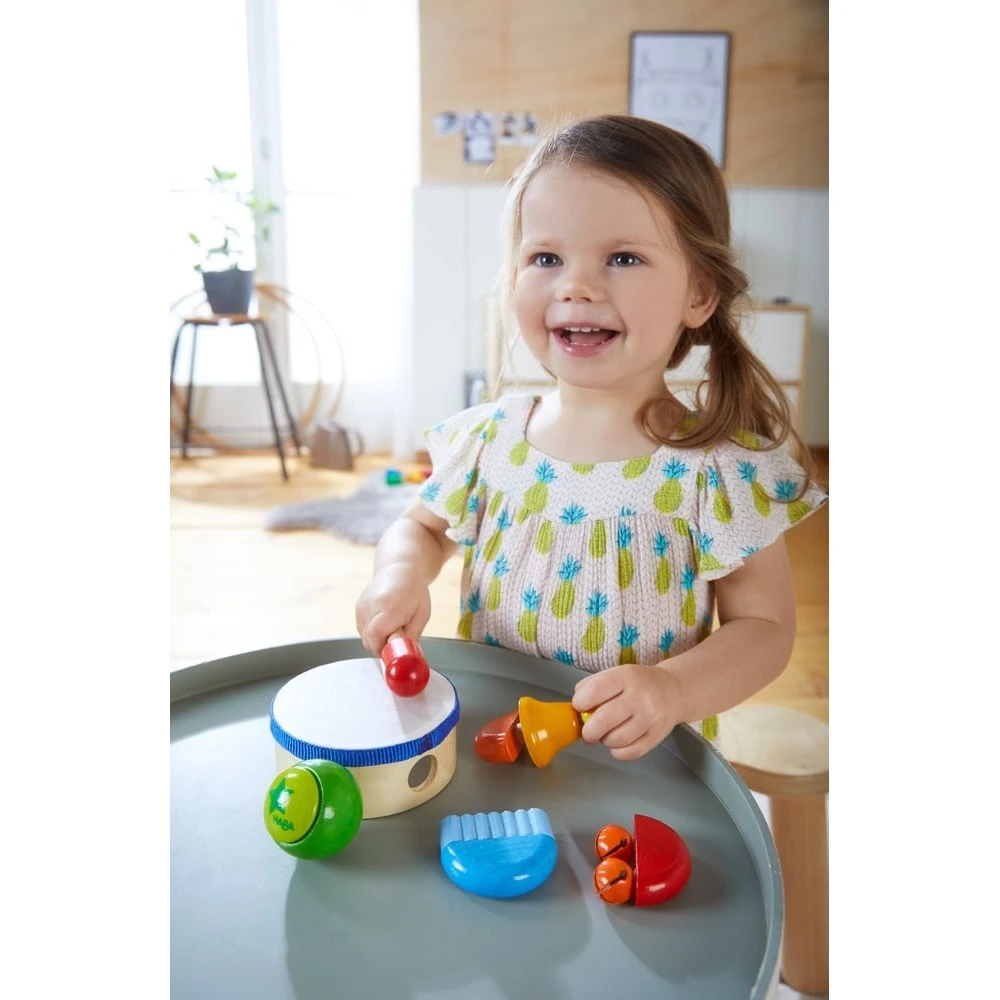 Contenu : 1 tambour, 1 baguette, 1 boule musicale, 1 instrument avec clochette, 1 instrument avec grelots, 1 mini güiro.