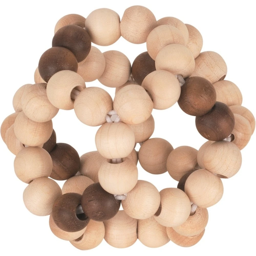 Voici un hochet à agripper assez particulier. Et pour cause, sa forme n’est pas sans rappeler celle d’une balle. Son design est le suivant : plusieurs hochets de formes circulaires composés chacun de perles de bois naturel attachés les uns aux autres par de petits élastiques. Plusieurs hochets pour le prix d’un !