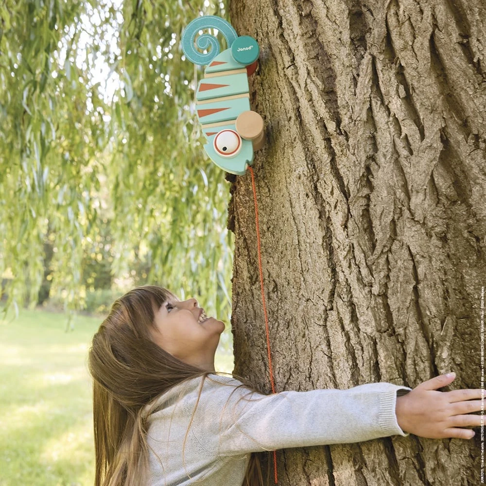 Prêts pour une balade sous les tropiques ? Bébé va pouvoir partir à l’aventure en promenant cet adorable caméléon à tirer en bois. Avec ses yeux qui roulent sur eux-mêmes et son corps articulé, ce jouet à promener ondule quand il roule ! De quoi amuser les enfants dès 12 mois pendant des heures. Avec son air rigolo et sa queue en feutrine toute douce, ce jouet d’éveil en bois va faire craquer toute la famille ! Idéal pour encourager les enfants à partir d’un an à se déplacer, ce joli caméléon sera le compagnon de leurs premiers pas. Ce jouet à tirer en bois est peint à l’eau, il est en bois issu de forêts gérées durablement (certifiées FSC®).