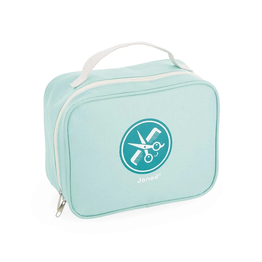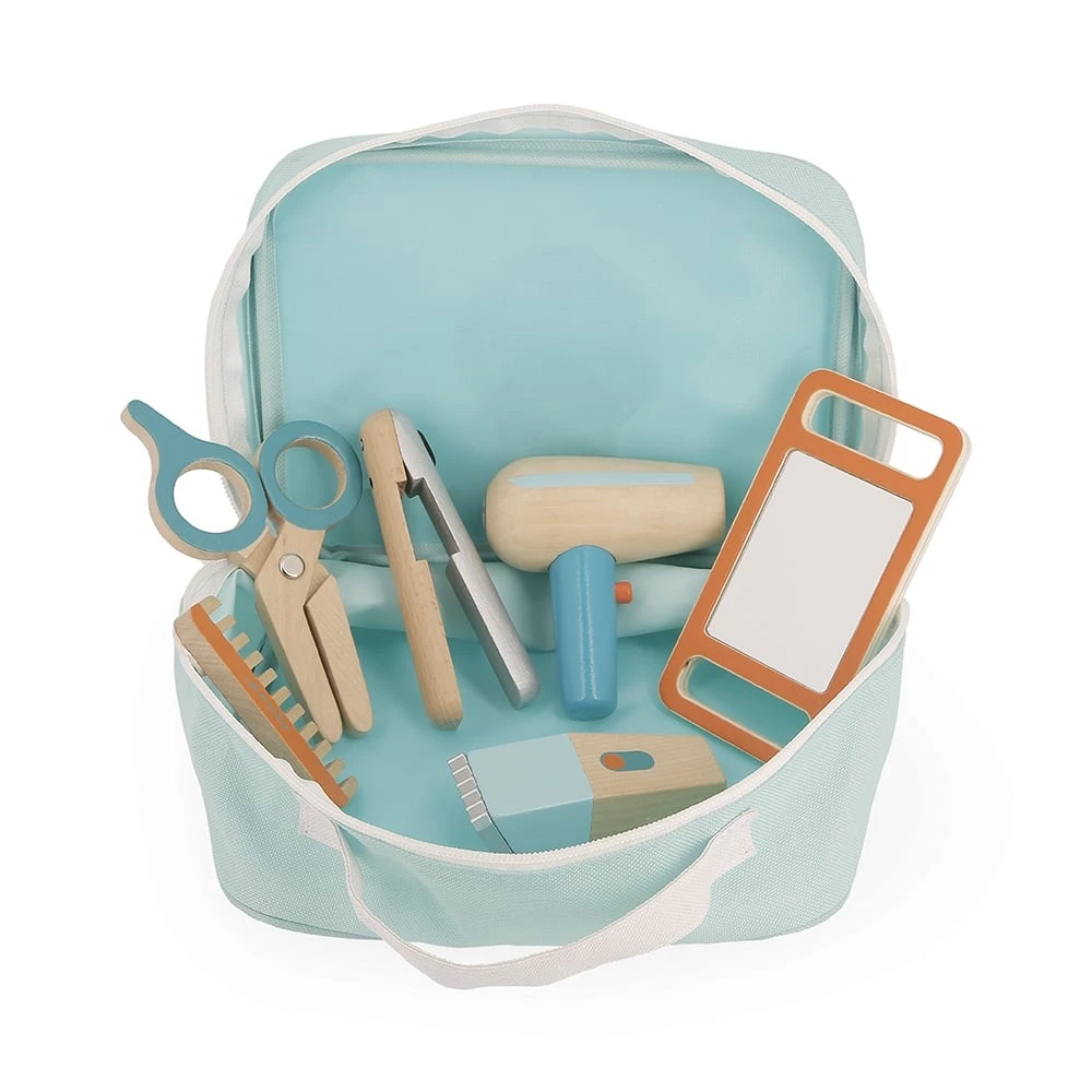Prêt pour une nouvelle coupe de cheveux ? Avec ce coffret de coiffure complet, votre enfant va faire des miracles sur votre style ! Dans sa petite mallette transportable en tissu, il aura tout le nécessaire pour exercer ses talents de coiffeur ou de barbier : Un peigne, un sèche-cheveux, une tondeuse, des ciseaux, un lisseur et l’indispensable miroir pour partager son œuvre avec le client du jour ! Tous ces accessoires sont en bois FSC (bois issus de forêts gérées durablement) et laisse apparaitre la couleur naturelle de celui-ci. On craque également sur le design soigné et les couleurs de ce kit du parfait petit coiffeur dans des tons bleus / orangés (peinture à l’eau) assortis à la trousse bleu ciel. Pratique, tous les accessoires se rangent dans cette dernière qui se ferme grâce à un zip. C’est parti pour des heures de jeu, à imaginer les coiffures les plus folles et à partager avec amis et famille ! Pour les enfants à partir de 3 ans.