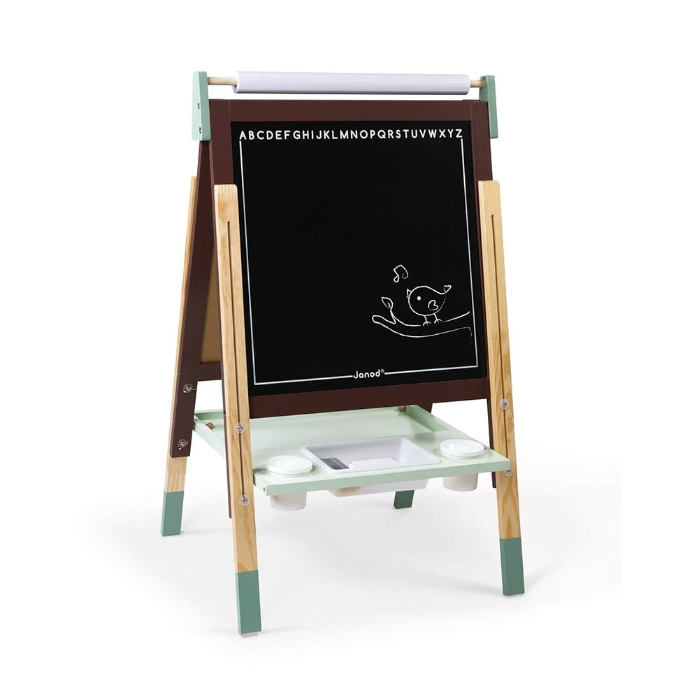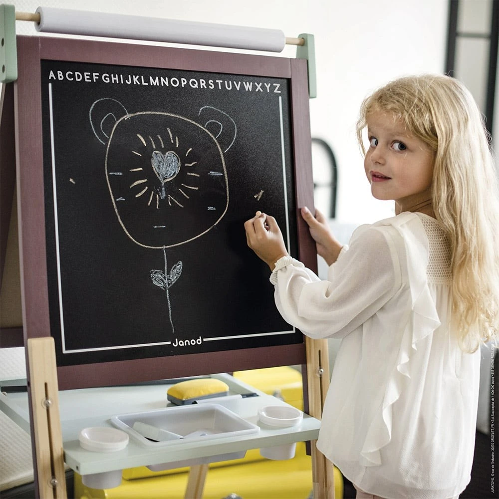 Ce tableau en bois permettra à votre enfant d’exprimer sa créativité sur deux surfaces. Il possède une face avec une ardoise blanche magnétique pour écrire avec un feutre effaçable et une face avec une ardoise noire pour écrire à la craie. Les pieds sont réglables de 91 à 126 cm pour permettre aux enfants d’utiliser leur tableau plus longtemps ! Contient de nombreux accessoires : 6 magnets, 10 craies, un feutre effaçable à sec, un rouleau de papier, une brosse à tableau et une règle aimantée. Très pratique, le tableau est pliable pour un rangement facile.