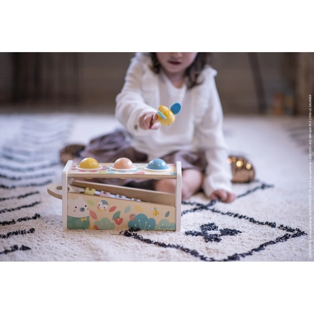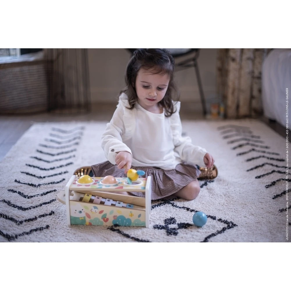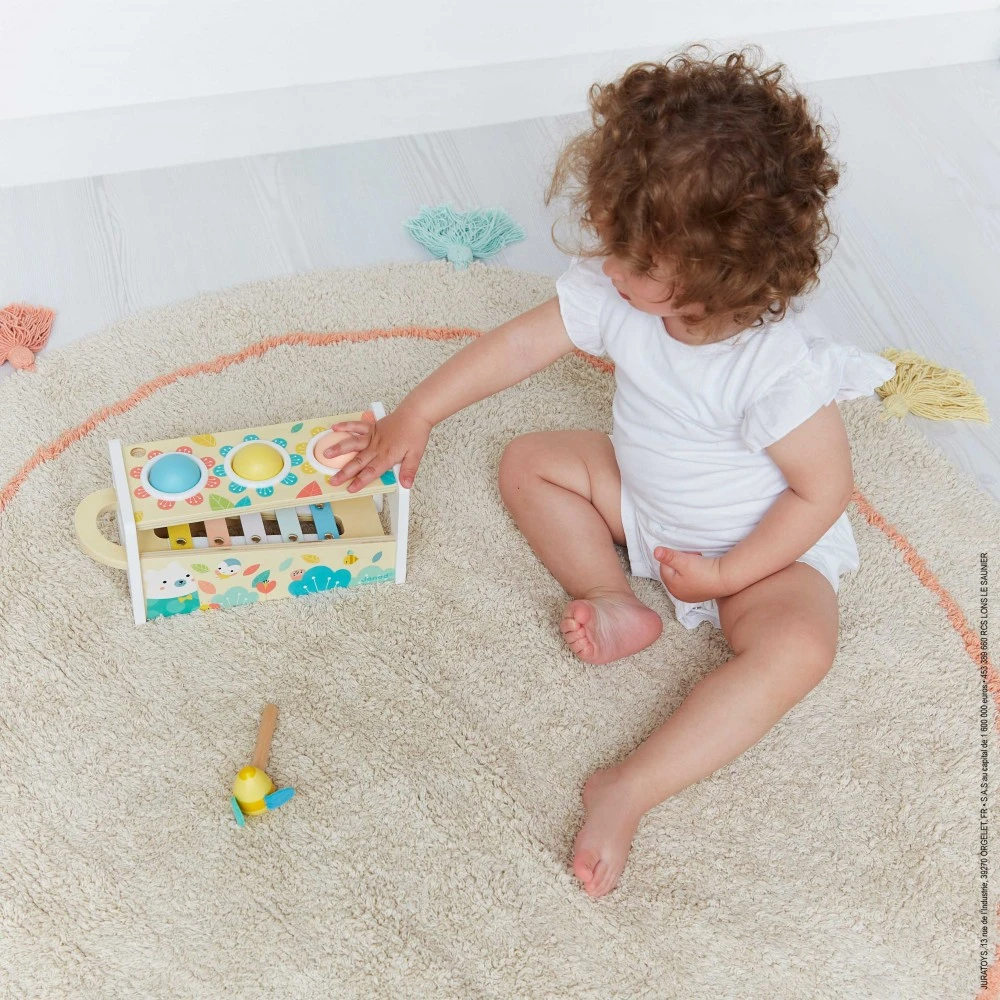 À la fois jouet à marteler et jouet d’éveil musical, il est composé d’un cadre en bois dans lequel on vient taper avec adresse 3 balles colorées dans les trous prévus à cet effet ; ces balles tombent sur les lames du xylophone posé au fond du cadre et roulent vers la sortie. Ce jouet stimule donc la coordination œil-main de votre enfant dès 1 an ainsi que sa motricité fine, sa dextérité et sa perception sensorielle. Marteler les petites balles lui permettra de se défouler et de découvrir le principe de cause à effet. La chute des boules sur les touches du xylophone éveillera son ouïe et sa reconnaissance des sons.