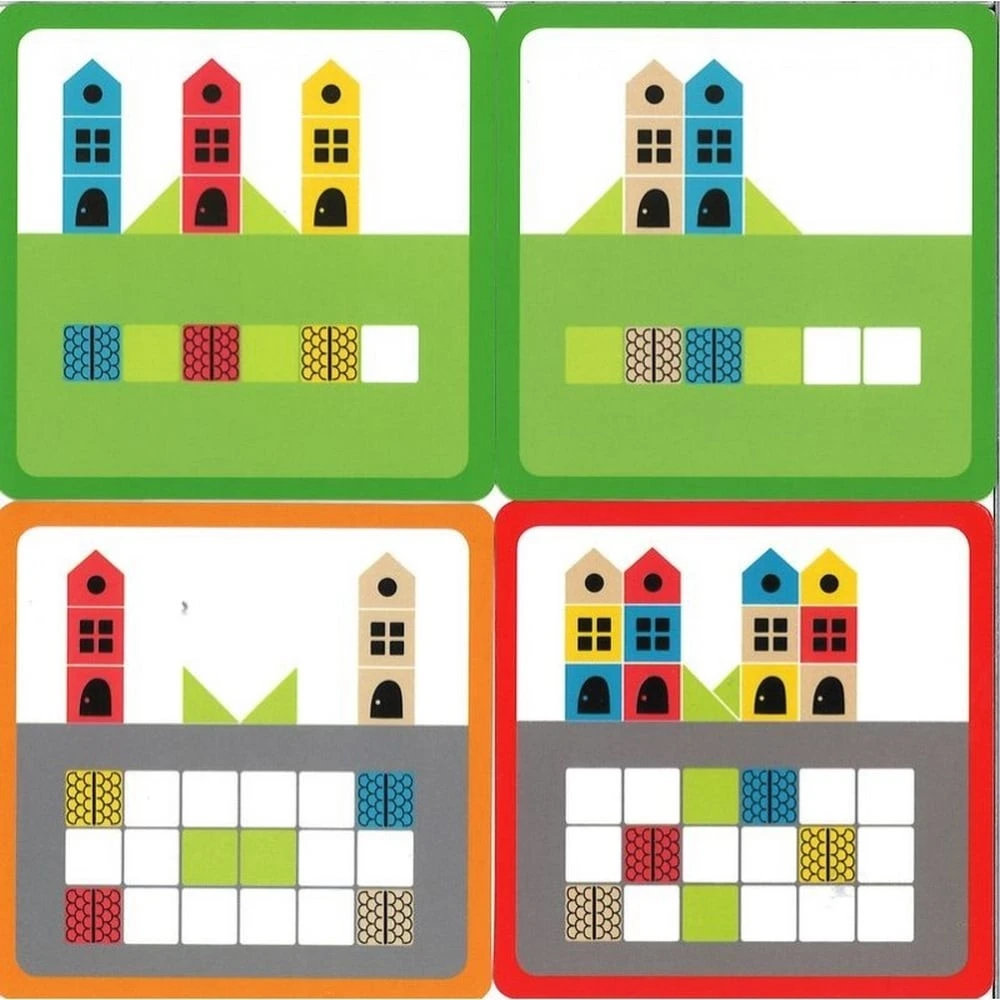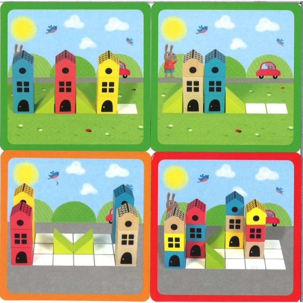Il consiste en des cubes en bois de différentes formes et couleurs à empiler en suivant les différents modèles pour construire des maisons qui peuvent être alignées ou réparties sur les plans du support. Il permet donc à votre enfant à partir de 3 ans de développer sa coordination œil-main, son observation, sa dextérité et sa représentation dans l’espace. S’il est encore petit, il manipulera les pièces et se lancera dans la construction libre et la découverte. En grandissant il pourra créer sa propre carte avec vue de face et vue de dessus ou rédiger la consigne écrite et la faire réaliser par un ami. À travers les 3 dimensions à reconstituer, il trie les pièces par couleur et développe ses repères dans l’espace. Il apprend ainsi à visualiser et prévoir pour arriver au résultat qu’il veut obtenir, ce qui lui permet également de travailler sa concentration et sa patience. Il aiguise son langage dans les échanges si le jeu est joué en groupe. Le jeu comporte également plusieurs niveaux de difficulté (vert : facile, orange : intermédiaire, rouge : difficile) à mesure que votre enfant gagne en agilité et en rapidité.