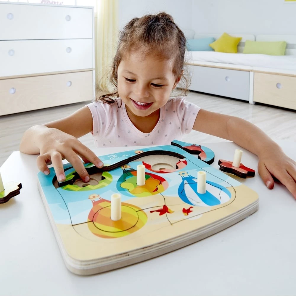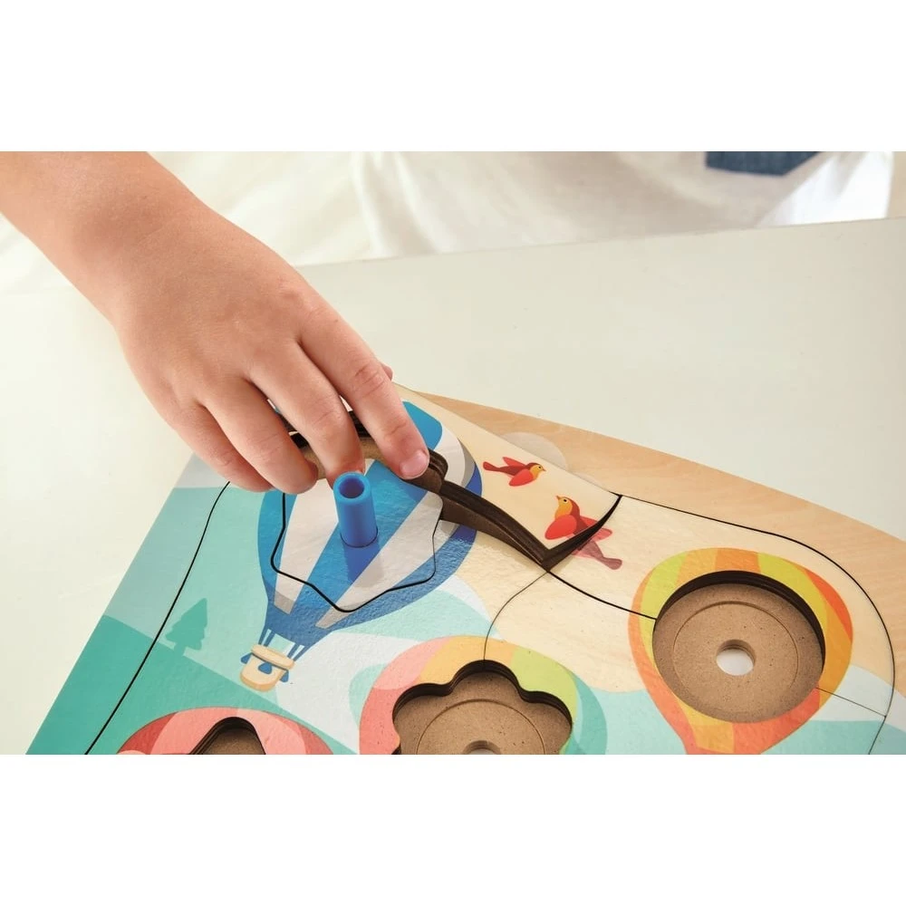 Le petit plus ludique de ce puzzle est que chaque montgolfière, munie d’un bouton de préhension, grâce à la petite pointe en plastique présente au verso, se transforme en toupie. Votre petit bout de chou regardera ses petites montgolfières tournoyer avec émerveillement sous votre impulsion puis il pourra tenter de les faire tourner par lui-même, apprenant ainsi de nouveaux mouvements ainsi que la notion d’équilibre et de rotation autour d’un axe. Un joli puzzle pour une activité calme, valorisante en toute autonomie !