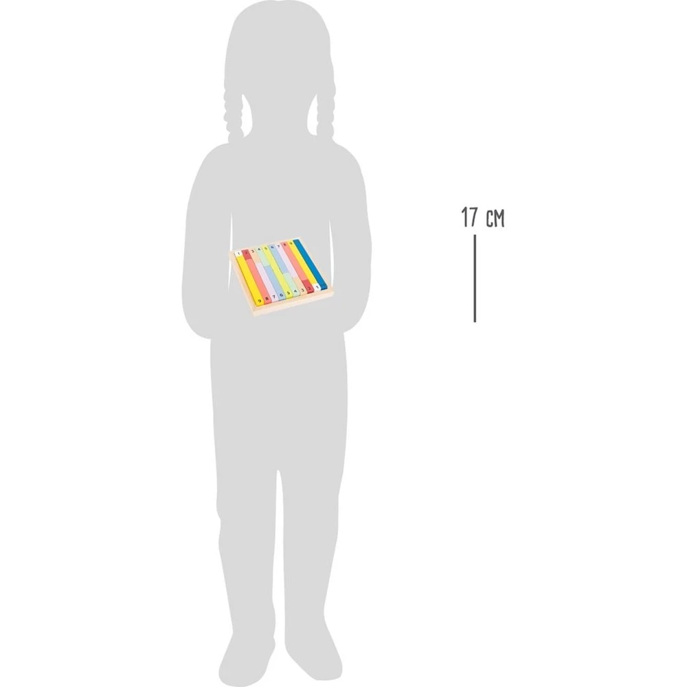 Ces bâtons de calcul d’inspiration Montessori aideront votre enfant dans son apprentissage des chiffres, des quantités, la notion de plus petit que et plus grand que, de complément, la compréhension des ordres de grandeur. A travers la manipulation et l’observation des bâtonnets de calculs, votre enfant pourra remarquer que chacune des pièces présente une longueur définie et différente. Il pourra alors s’amuser à les comparer, les classer, les trier, et les ranger par ordre de taille. Il pourra superposer des réglettes, en ajouter de nouvelles ou en retirer et donc aborder en s’amusant, sans s’en rendre compte, des opérations simples telles que les additions et les soustractions. La visualisation des opérations est très facile, il suffit de positionner côte à côte les bâtonnets correspondant à un calcul, addition par exemple, et le bâtonnet correspondant au résultat. Avec ce jeu éducatif en bois votre enfant pourra de manière autonome, par la manipulation de ces réglettes, visualiser les opérations, de les rendre concrètes et d’amorcer la compréhension des mécanismes mathématiques de base.