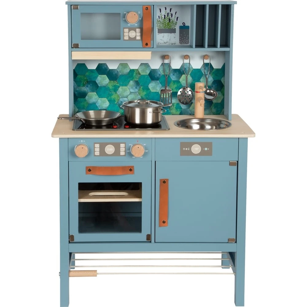 Un chef-d’œuvre ! De construction robuste, cette cuisine de jeu impressionne par son design moderne dans la couleur tendance bleu fumée, associé à des poignées en imitation cuir de couleur cognac. Le look est complété par des éléments tels qu’une paroi arrière réversible (aspect uni/carreau) et les surfaces du réfrigérateur et du four imprimées avec des détails de cuisine. Le comptoir, les boutons rotatifs à « clic », la table de cuisson électronique avec lumière/son, l’évier en métal, les rangements pour les ustensiles et le four avec plaque de cuisson permettent de jouer de manière réaliste. Le plus : la hotte aspirante escamotable et la plaque de cuisson amovible pouvant être utilisée comme tableau noir ! Une casserole, une poêle et des couverts de cuisine prêts à jouer inclus ! Piles non incluses !