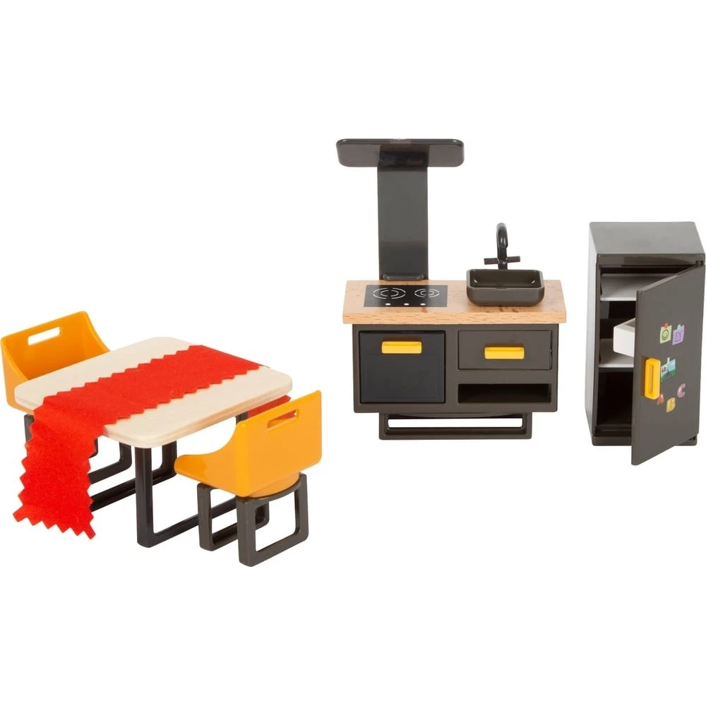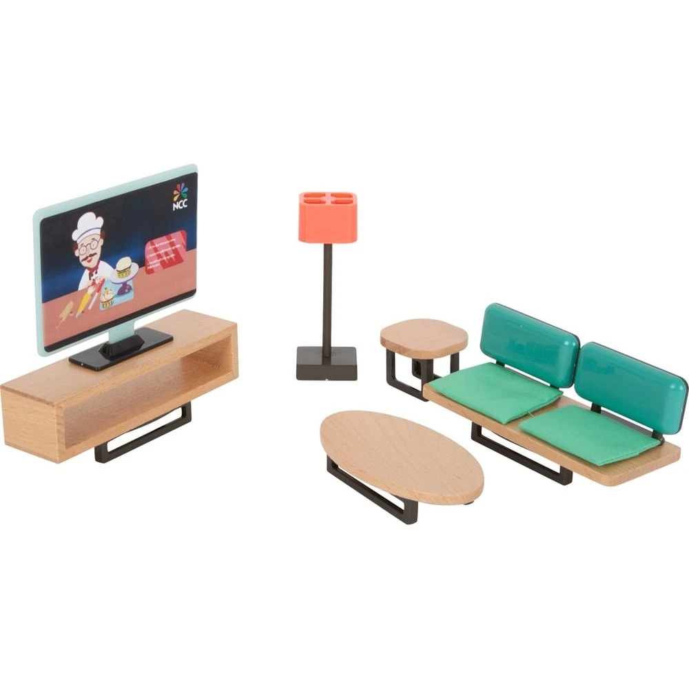 Ce set de meubles pour maison de poupée donnera une petite touche contemporaine et élégante qui embellira le petit monde miniature de votre enfant. Dans ce théâtre où votre bambin jouera à faire vivre à ses poupées des histoires inspirées de son quotidien, de ses observations relatives à son environnement et où il y reproduira tous les événements marquants de sa journée, ses accessoires de décoration lui permettront d’ouvrir le champ des possibles et donneront de la matière à son imagination et sa créativité. Les petites ou grandes histoires nécessitent de faire vivre la maison de poupée par le déplacement du mobilier et des personnages ainsi que la décoration d’intérieur. Les éléments de cet ensemble aideront votre enfant à travailler par le jeu sa motricité fine et sa coordination œil-main. Cet ensemble convenant aux poupées mesurant jusqu’à 12 cm de hauteur se compose de :