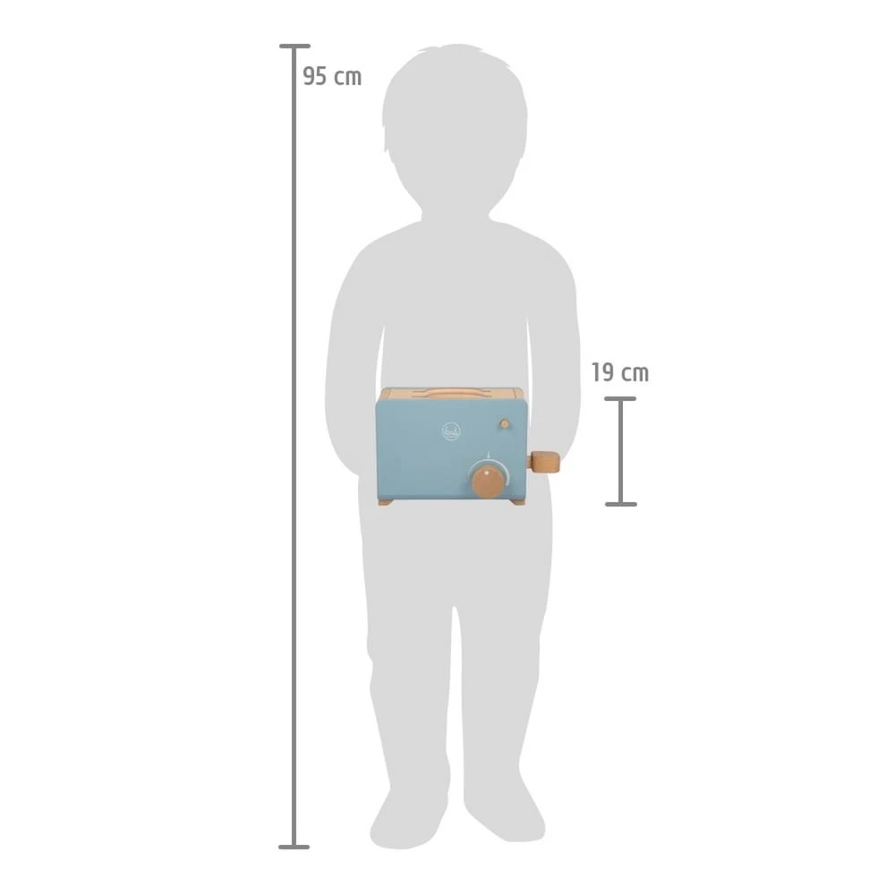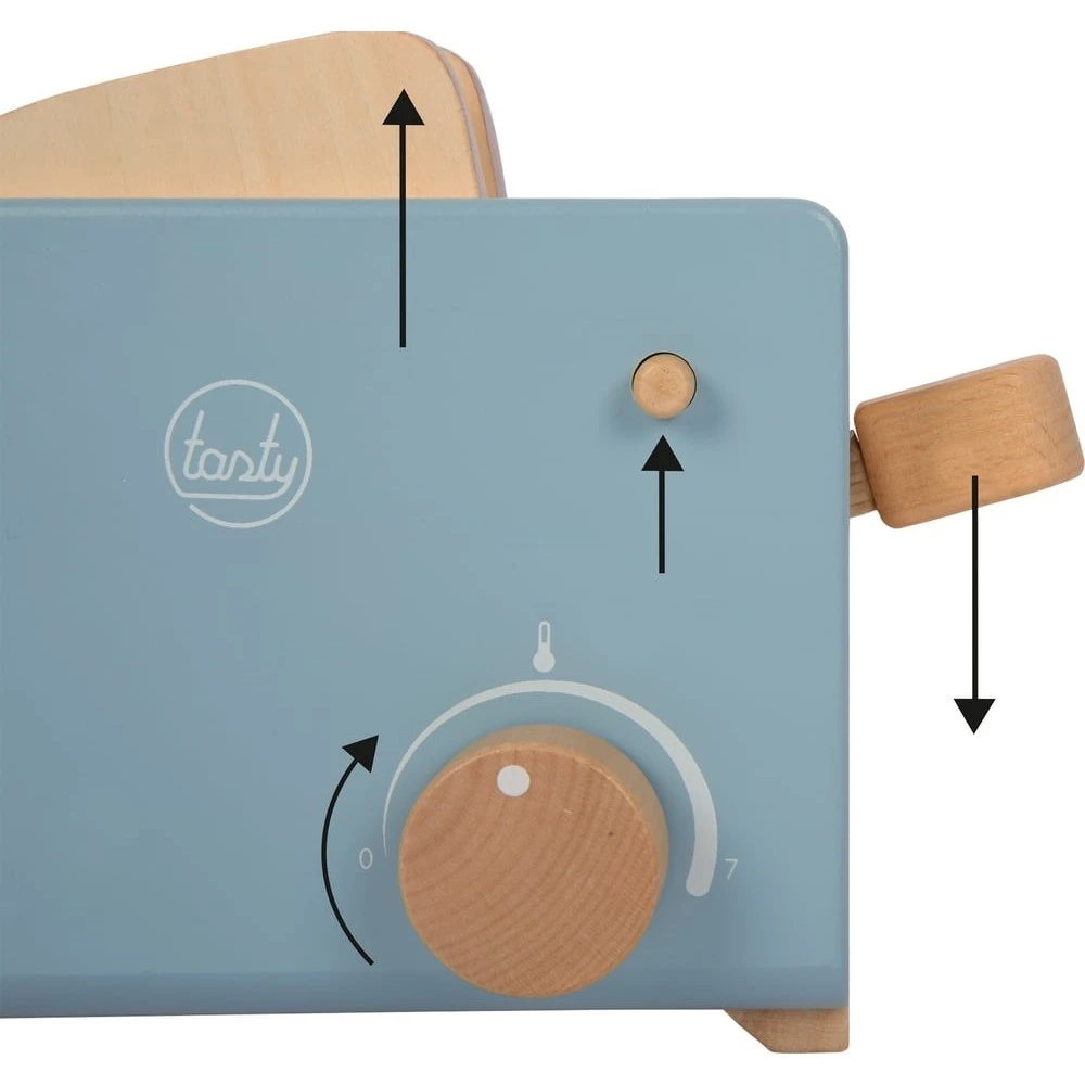 Avec ce grille-pain et ses accessoires, chaque petit-déjeuner dans la cuisine d’enfant est une réussite. Le grille-pain convainc fonctionnellement par sa fonction pop-up et visuellement par son design particulièrement discret avec du bleu fumé clair, du blanc et beaucoup de bois naturel ! Les nombreux accessoires tels que les tranches de pain grillé, couteau, planche, beurre et confiture, ainsi que le son « clic » du bouton de température, garantissent un plaisir de jeu réaliste.