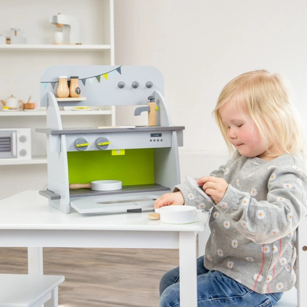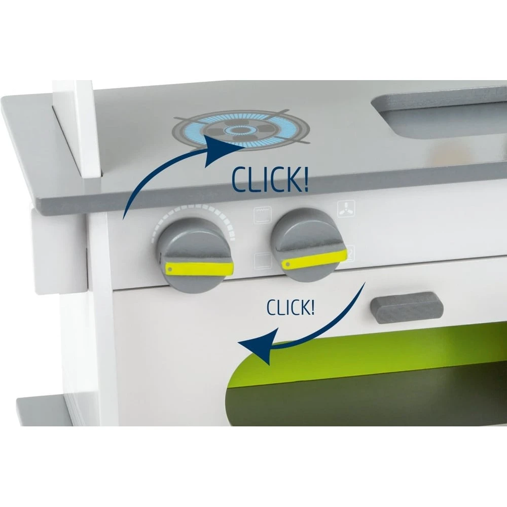 Une jolie cuisinette en bois digne des plus grands chefs ! Cette cuisine en bois offre tout ce dont a besoin un petit cuisinier : des ustensiles de cuisine (cuillère, fourchette, spatule, casserole, poêle, couvercle), des condiments (sel, poivre), un évier et même un four avec un volet d’ouverture pour plus de réalisme. Une cuisinette en bois au design simple sur les tons gris et vert. Vous seriez surpris de voir à quel point votre enfant de 3 ans vous observe et de l’imagination dont il fait preuve. Ce jeu d’imitation en bois laisse la place à toutes sortes de scénarios et de mises en scène. Quand il fera semblant de se retrouver dans les situations hasardeuses que nous avons tous connues en cuisine, quand il surveillera sa casserole sur le feu en même temps que son plat dans le four, qu’il reproduira les mouvements que vous faites en nettoyant la vaisselle, quand il versera le sel et le poivre dans son festin en préparation ou bien quand, très concentré et les yeux rivés sur son assiette, il vous servira sans ne rien faire tomber, … Les actions, les mouvements, les étapes de préparation d’un plat permettront à votre enfant de développer sa motricité fine, son habileté et sa coordination œil-main. Attention quand même à ne pas faire brûler la nourriture pour pouvoir régaler les convives.