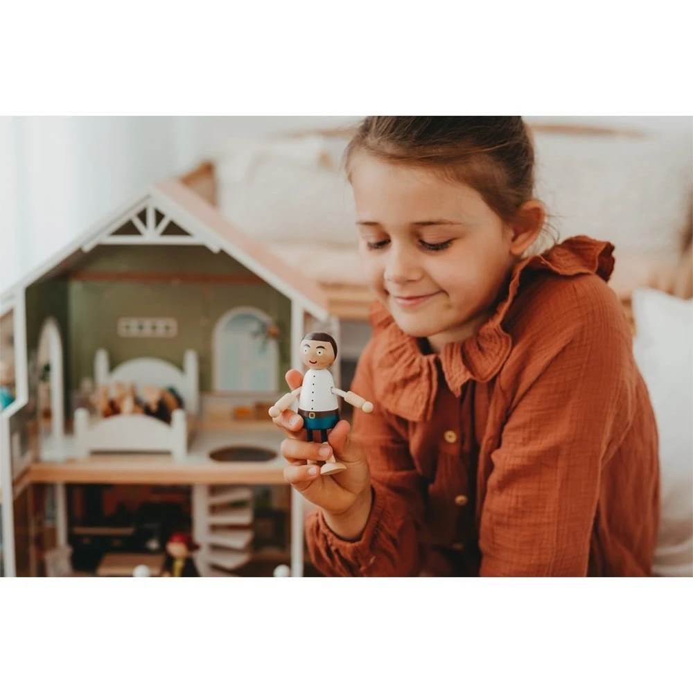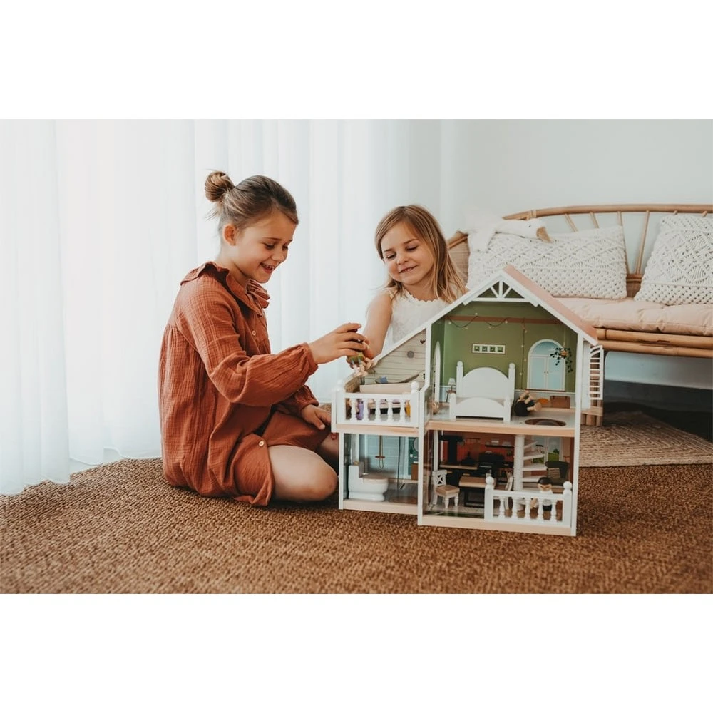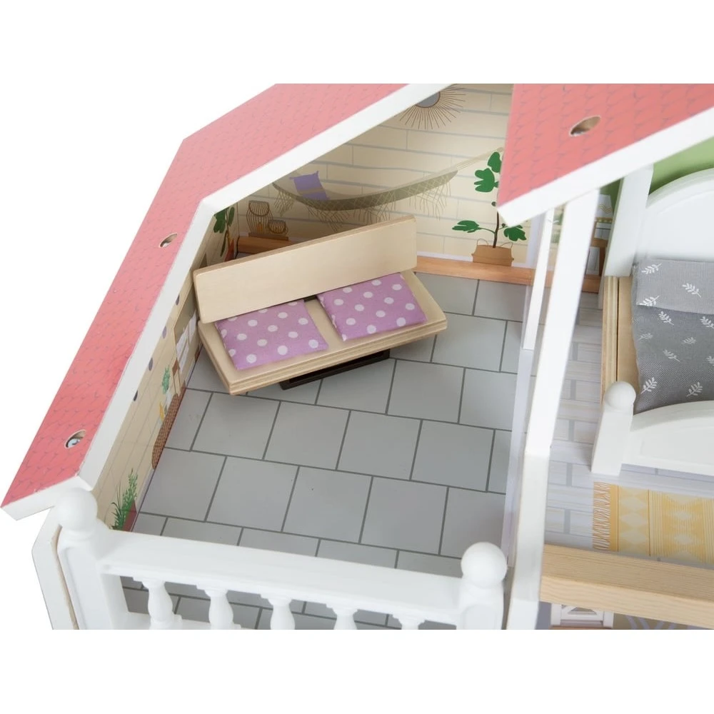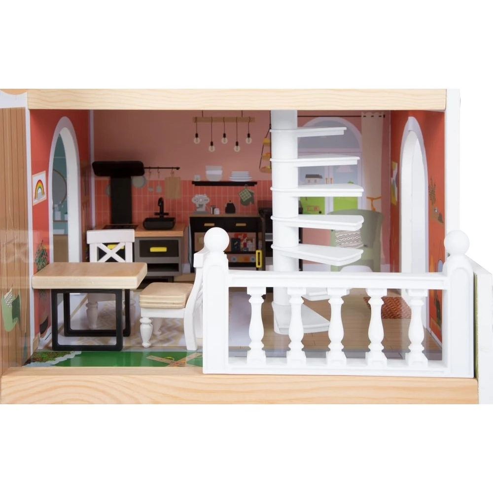 Cette maison de poupée moderne en bois avec façade ouverte convainc par ses détails de conception, ses accents décoratifs et son style de vie moderne. Le salon avec cuisine et salle à manger, la chambre et la salle de bain ainsi que la terrasse sur le toit et le jardin de devant offrent toutes les possibilités pour un jeu imaginatif et un jeu de rôle actif. Le concept d’habitation ouvert, l’escalier en colimaçon, les fenêtres à ouvrir et une douche moderne de plain-pied avec une paroi de douche en verre acrylique font de la maison de poupée, avec ses huit meubles fonctionnels et des éléments textiles tels que le linge de lit et les coussins, un élément qui attirera tous les regards dans la chambre d’enfant.