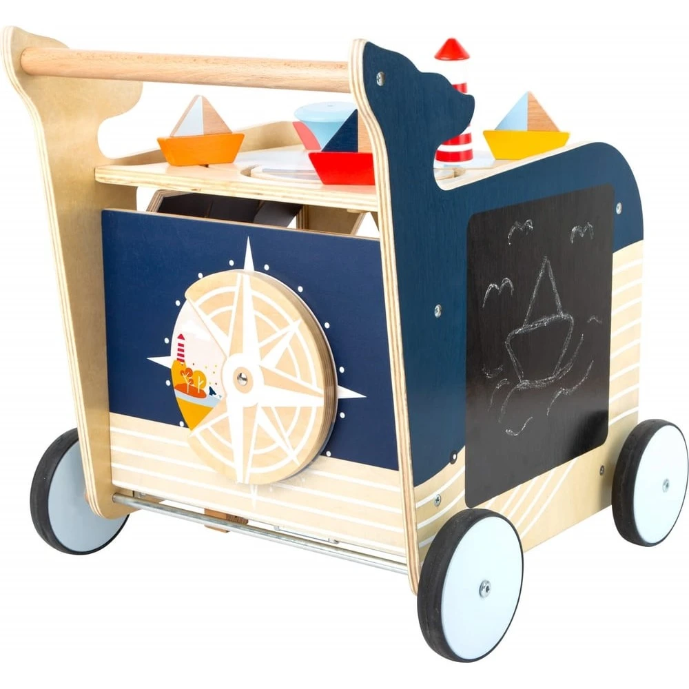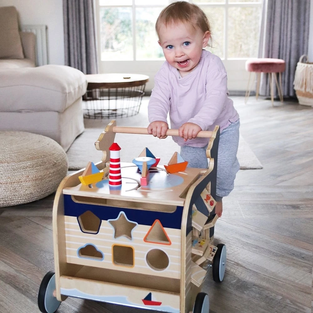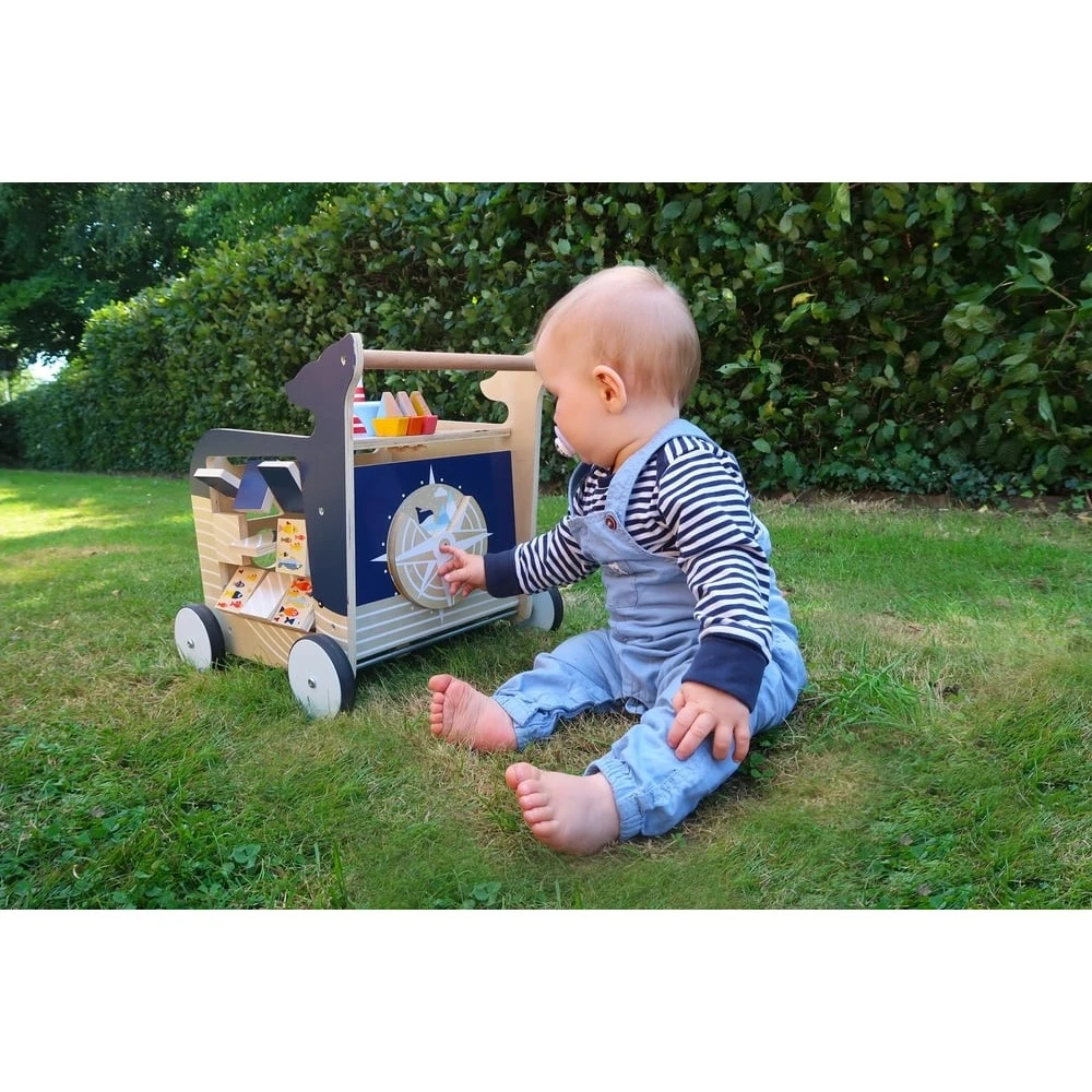 Une fois la marche acquise, ce trotteur en bois continuera d’amuser bébé, de l’éveiller et de le stimuler grâce aux nombreuses activités qu’il propose sur ces différentes faces :