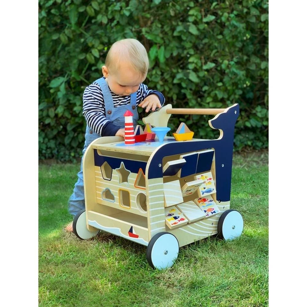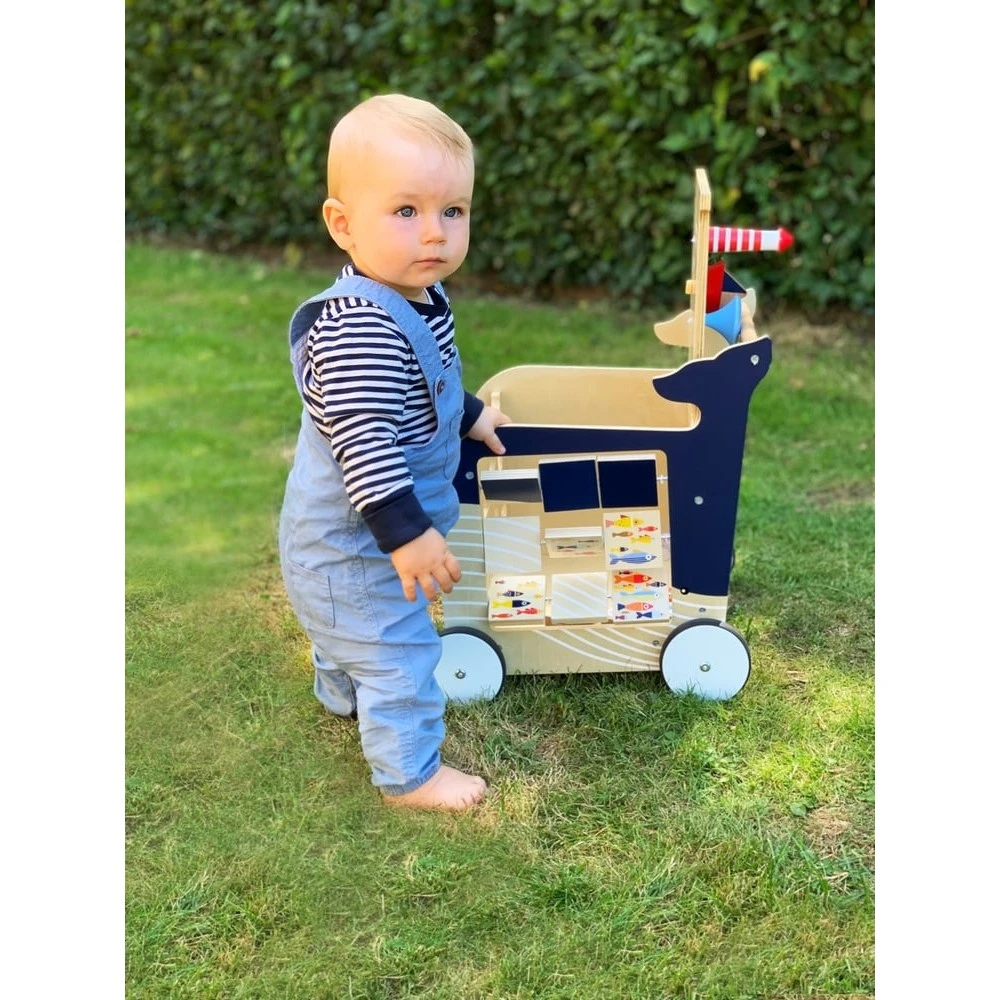 Mais ce trotteur-pousseur en bois est plein de surprise, il pourra également être utilisé pour remplir le ventre de la baleine (couvercle à charnière avec protection anti-pincement) et transporter peluches, livres, jouets et petits trésors.
