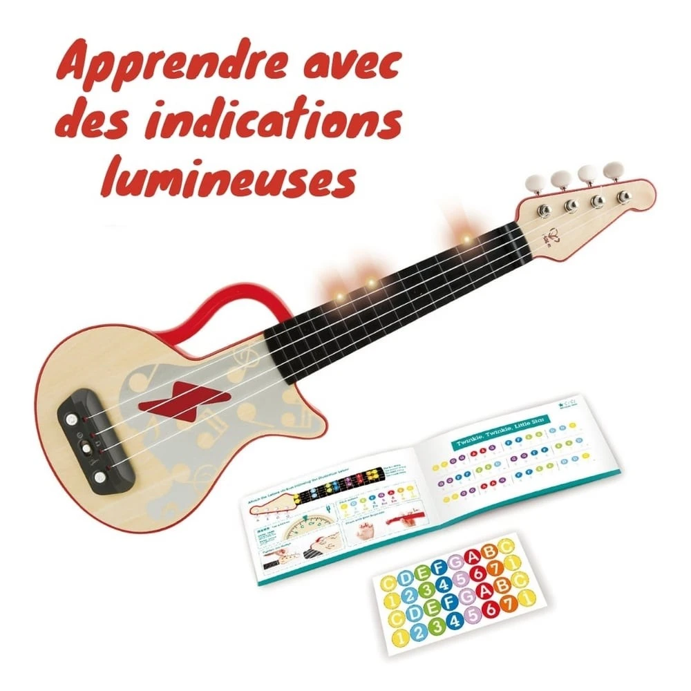 Cette très jolie guitare à 4 cordes (53 x 17 x 6,2 cm), adapté aux petites mains de votre bout de chou, est un excellent compagnon pour s’initier doucement à la pratique de ce type d’instrument de musique. Elle est dotée de lumières clignotantes (3 piles AAA fournies), qui s’illuminent quand l’enfant joue, lui permettant ainsi d’apprendre progressivement à jouer et à maitriser les 6 mélodies décortiquées dans le livret de partitions simples. Pour l’aider dans cet apprentissage ardu, une planche d’autocollants des notes codées (A, B, C, D, E, F et G ou 6, 7, 1, 2, 3, 4 et 5 – correspondant à La, Si, Do, Ré, Mi, Fa, Sol dans cet ordre) à fixer sur le manche pour guider plus facilement la lecture des partitions, accompagne l’instrument. Une fois les 6 chansons acquises avec succès, votre bambin, confiant et motivé, pourra sélectionner le mode libre pour jouer avec les accompagnements et créer ses propres mélodies. Plus qu’un jouet, cet instrument de musique pour enfant lui permettra également de s’essayer à l’exercice complexe qu’est celui d’accorder son instrument.